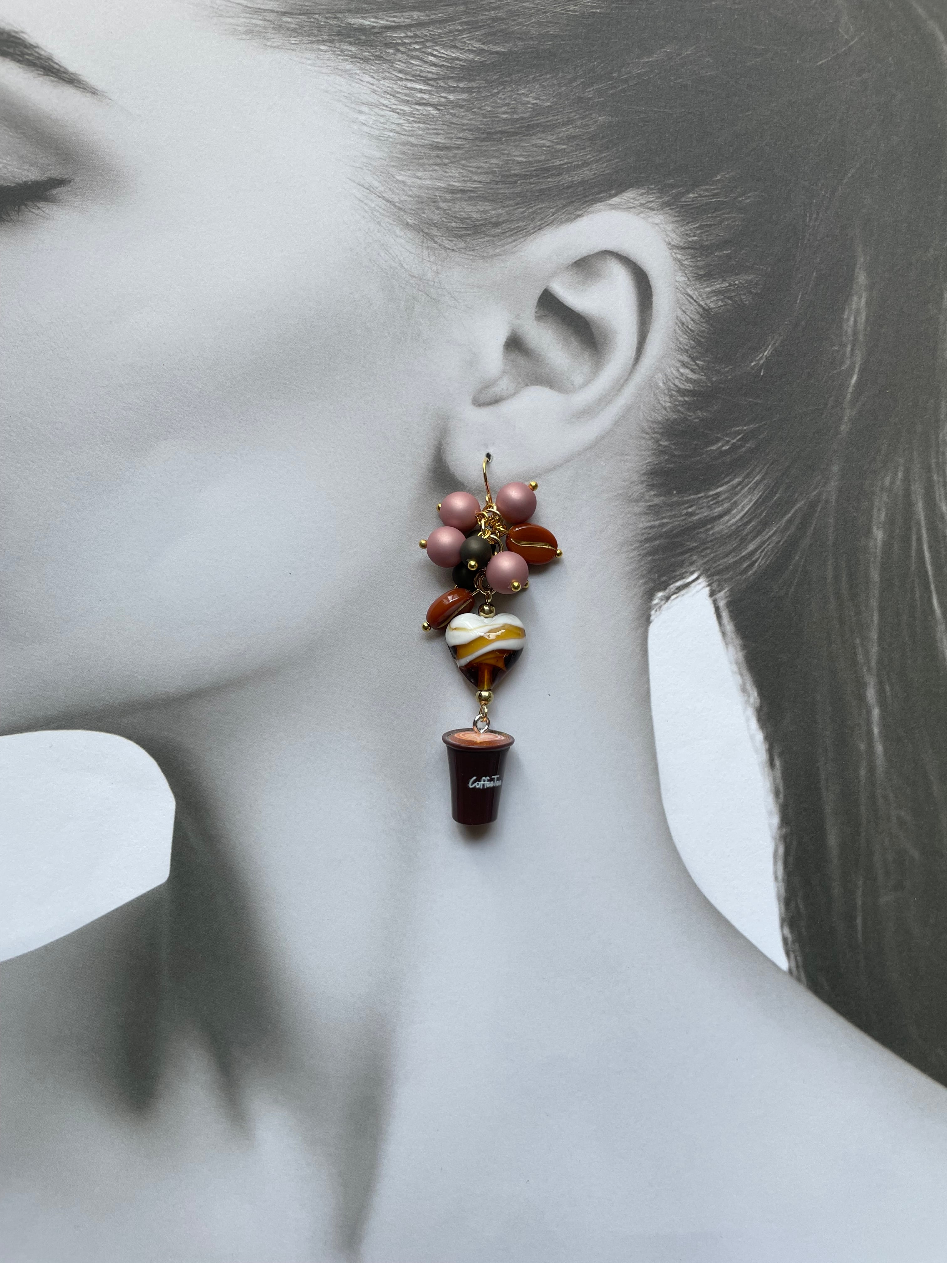 テイクアウトカップにラテアートが施された、遊び心あるチャームを主役にした耳飾りです。