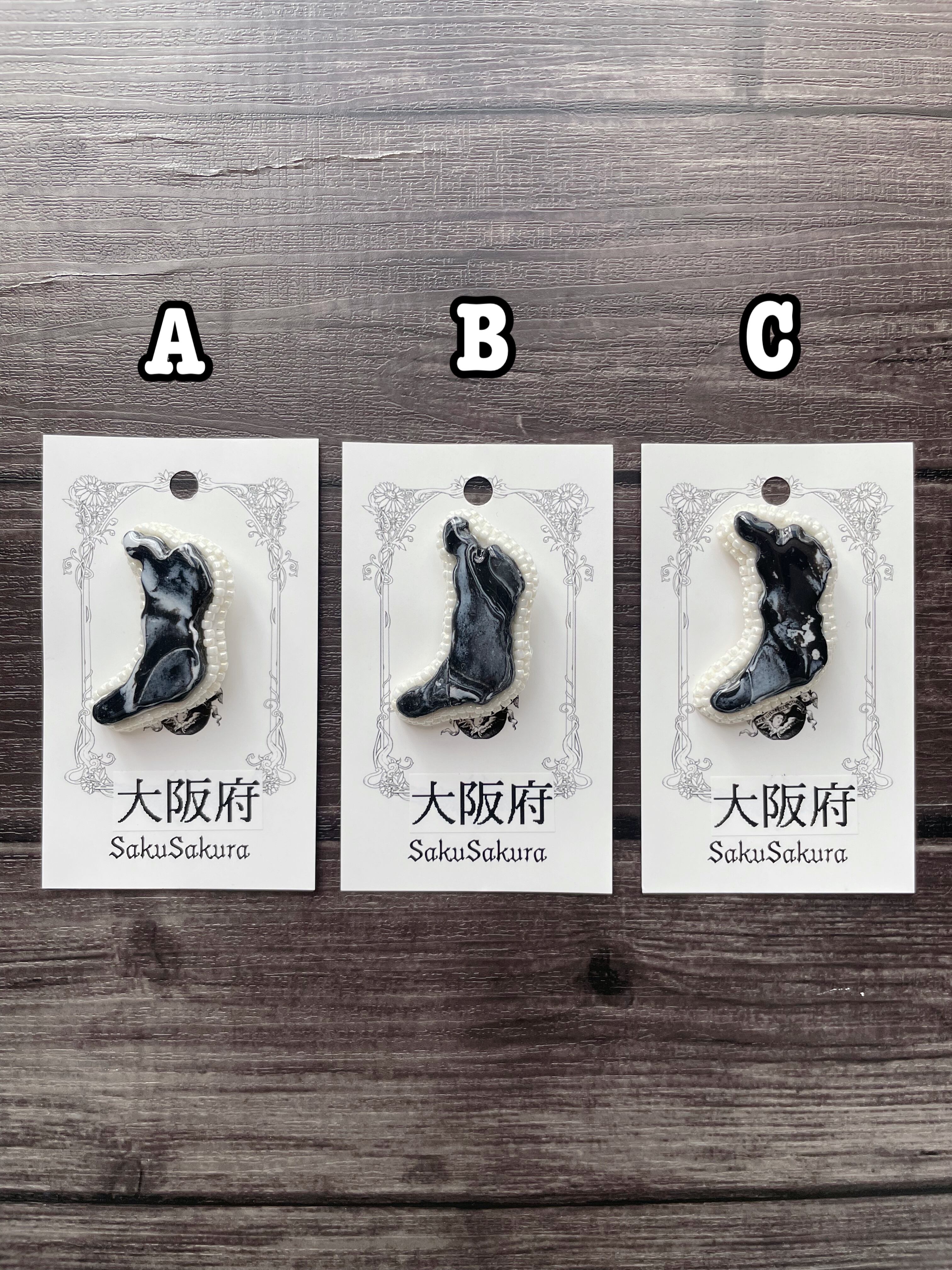 ポリマークレイで成形し、マーブルカラーで仕上げた都道府県ブローチ。