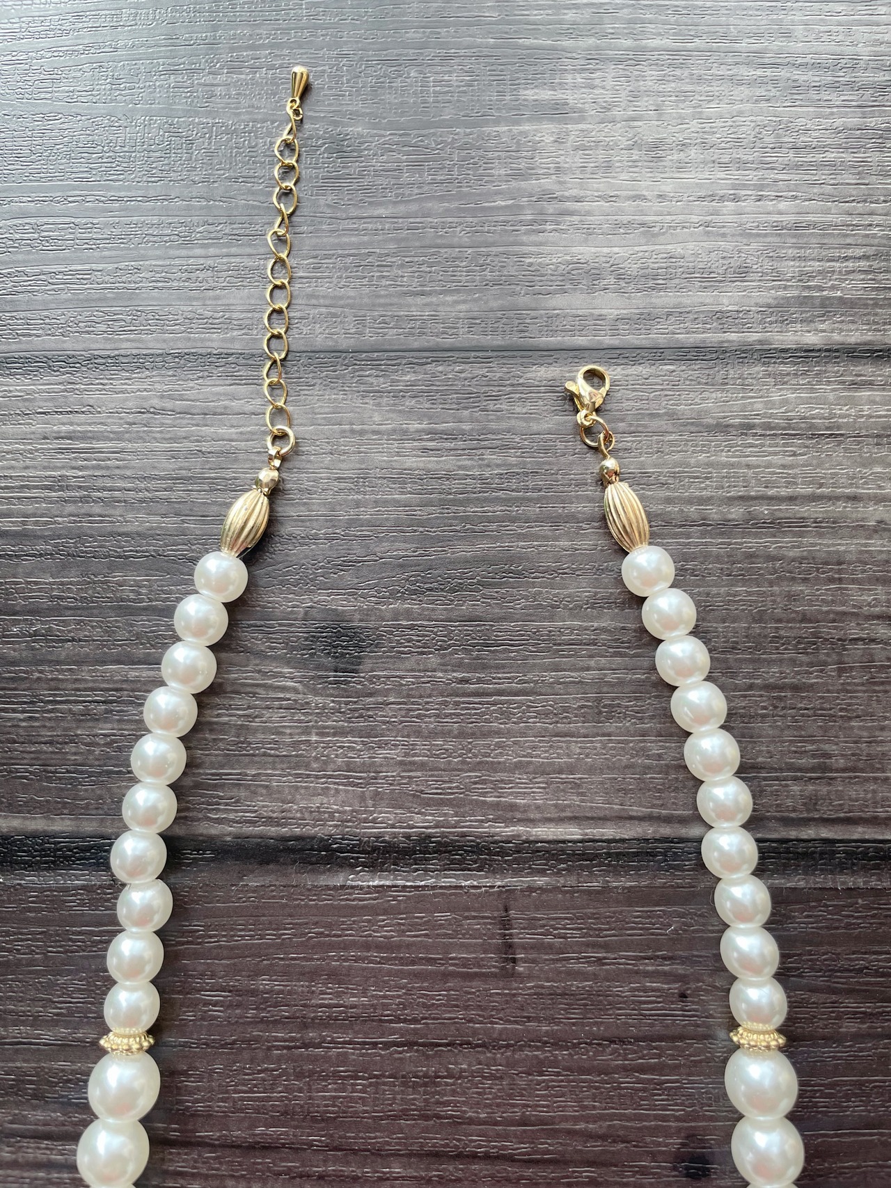 買い物カゴを主役に、ホワイトの樹脂パールを組み合わせた遊び心溢れる個性派ネックレスです。