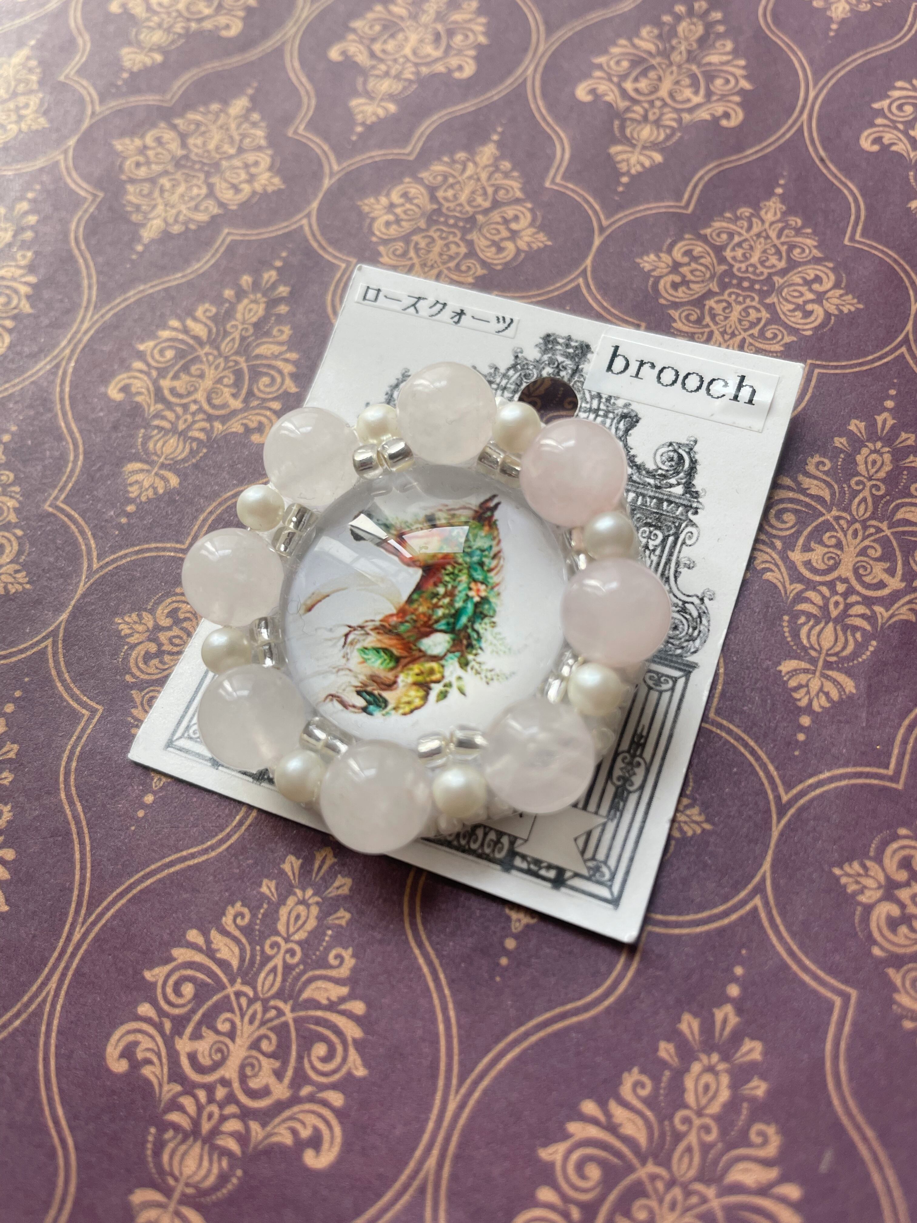 お花を纏ったエレガントなお馬さんのカボションを、淡いピンクのローズクォーツで囲んだブローチです。